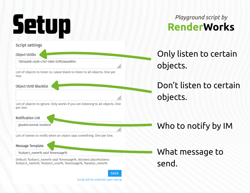 Instantly relay local chat messages sent by in-world objects to one or more avatars.