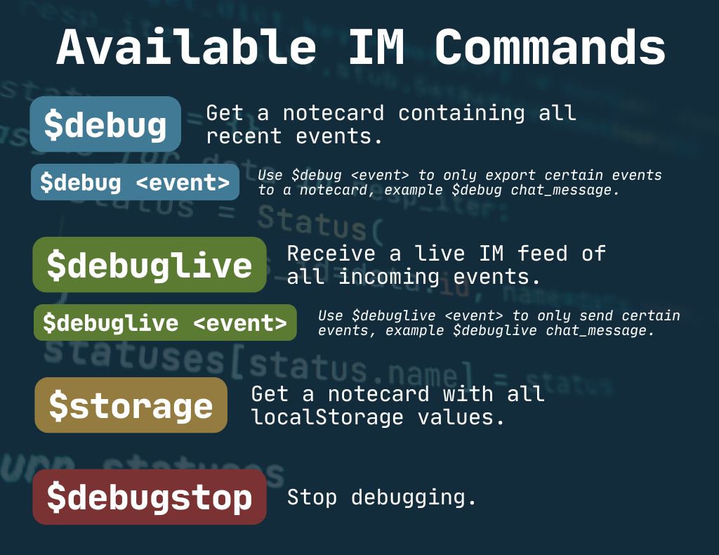 $debug <eventName> - Receive a notecard with script and recent logs for a specific event.