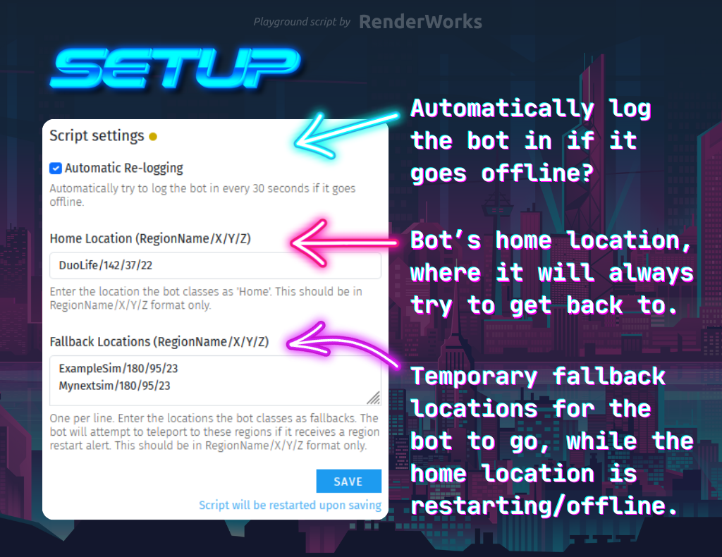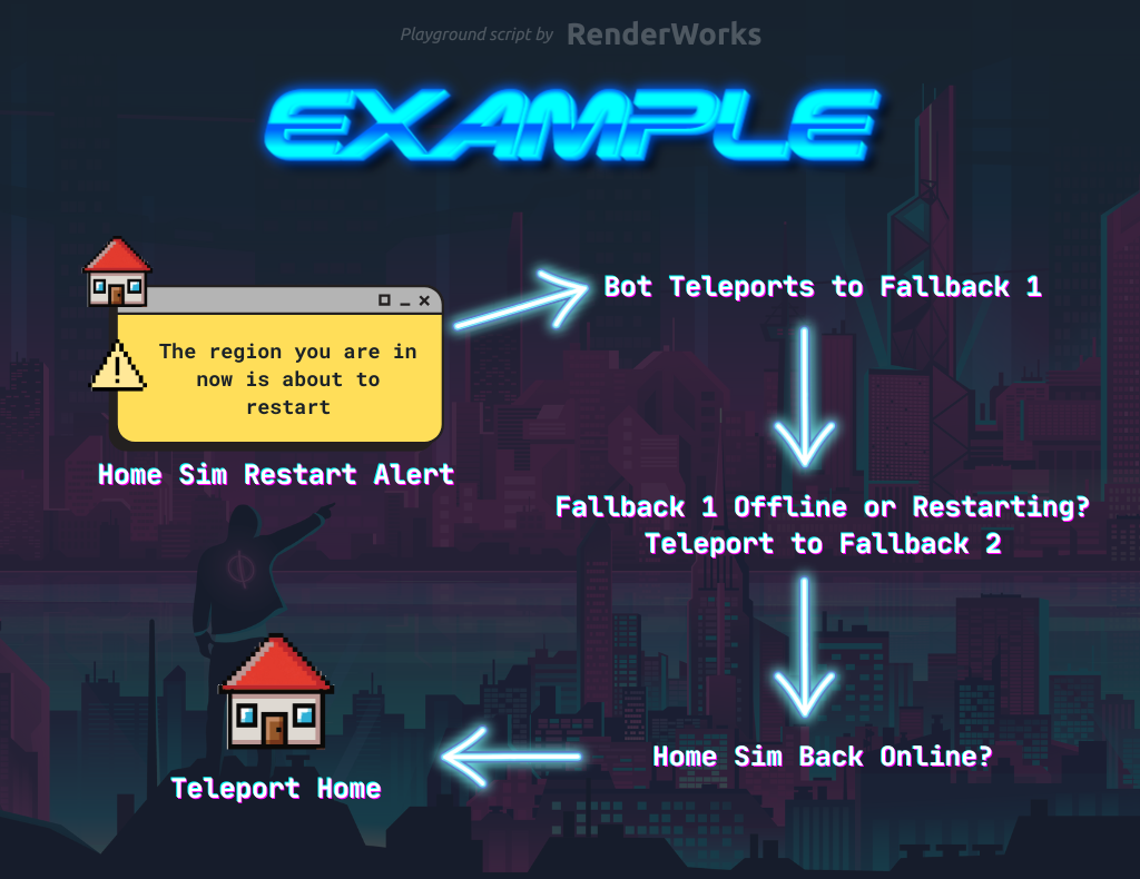 Keep your bot online, even during LL restarts! Define fallback locations for your bot to teleport to when your home location is restarting or offline! The bot will always try to teleport back home.