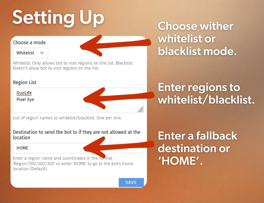 Choose between two modes. Whitelist only allows your bot in specific regions -- if teleported anywhere else, it's sent back immediately. Blacklist allows your bot everywhere except specific regions you define.